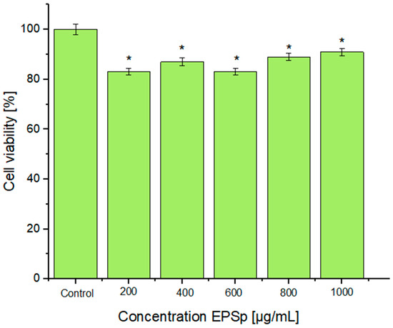The cytotoxicity of EPSp in HeLa cells treated with the different concentrations of EPSp (200, 400, 600, 800, and 1000 μg/mL) is shown in Figure 2. The cell viability was above 80% very close to the control, and in no case was the cell proliferation compromised. These results demonstrated that the negative charges of the EPSp were not detrimental. The EPSp was less cytotoxic when compared to those obtained by other strains of the same species. This was the case for EPS-1 from B. licheniformis B3-15 with cytotoxicities of 29% at 500 μg/mL [19], whose EPS-1 was composed mainly of mannose, and from B. licheniformis PASS26, with a cytotoxicity of 46.2% at 800 μg/mL [20], composed of mainly mannose and galacturonic acid.