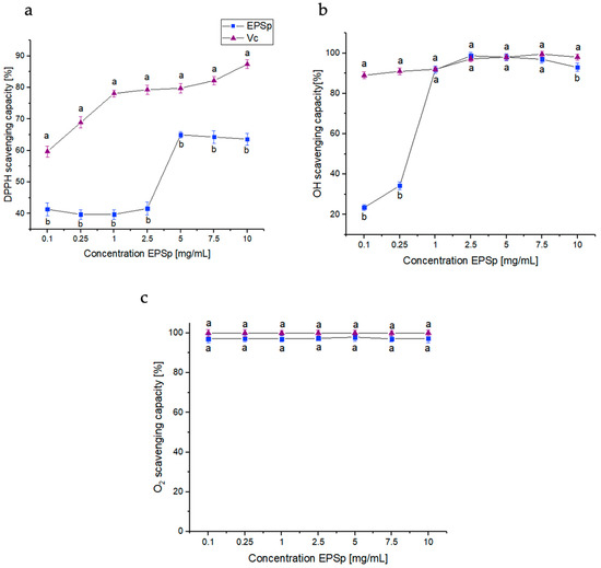 Non-enzymatic antioxidant radical scavenging activity: (a) 1,1-diphenyl-2-picryl hydrazyl radical (DPPH), (b) hydroxyl radical (OH), and (c) superoxide radicals (O2−). Different letters (a,b) indicate significant differences between concentration of Vc and EPSp (p < 0.05).