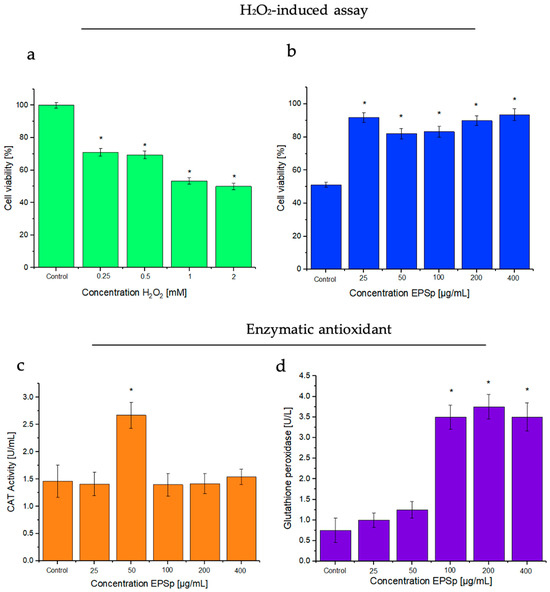 H2O2-induced assay: (a) evaluation of the H2O2-damaged HeLa cells, and (b) evaluation of the protection of H2O2-damaged HeLa cells protection with EPSp. Enzymatic antioxidant activity: (c) catalase activity in the presence of EPSp, and (d) glutathione peroxidase activity in the presence of EPSp. * Indicates significant differences between control and concentration of EPSp (p < 0.05).