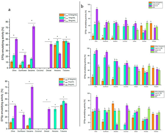 Emulsifying activity of EPSp at concentrations of 0.5, 1, and 2 mg/mL: (a) emulsifying activity with the different natural oils and hydrocarbons used at 24 h (E24) and 168 h (E168) (* p < 0.05), (b) comparison of emulsifying activity at different concentrations of EPSp versus commercial emulsifiers (Triton X-100, Tween 20, and SDS) across different natural oils and hydrocarbons at 24 h (E24). Different letters (a–d) represent the statistical difference between different emulsifiers for each natural oil and hydrocarbon (p < 0.05).