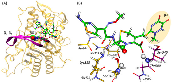 (A) The structure of PBP235/02 (yellow ribbons) with the β3–β4 loop colored purple (residues 498–518); the QM part in the QM/MM MD simulations is shown in the balls and sticks representation. Ala501 that is substituted with other residues is highlighted by van der Waals spheres. (B) The QM subsystem. The fragment of the antibiotic ceftriaxone leaving during the reaction is in the yellow oval, the spheres indicate the atoms of the carbonyl group of ceftriaxone, and the atoms form the oxyanion hole (NH fragments of Thr500 and Ser310). The color code is oxygen—red, nitrogen—blue, sulfur—yellow, and hydrogen—white. The color code for carbon atoms is green for ceftriaxone, purple for fragments of the β3–β4 loop and yellow for the rest of the protein.