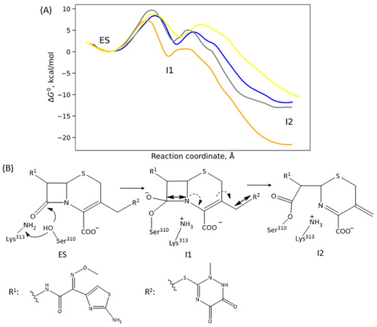 The Gibbs energy profiles for each elementary step along the reaction pathway were calculated using the umbrella sampling approach [36,37]. The sets of 5–10 ps runs were performed with harmonic potentials centered at different values of reaction coordinates. The force constant of the harmonic potential ½·K·(ξ − ξ0)2 was usually set to 40 kcal/mol/Å2, and additional trajectories with K = 80–120 kcal/mol/Å2 in transition state regions were calculated in several runs. Harmonic potentials were centered every 0.2 Å along the reaction coordinates. The MD trajectories of the PBP2 enzyme and its mutant forms were combined using both the weighted histogram analysis method (WHAM) and umbrella integration (UI). The quality of distributions was monitored by the overlap and consistency of Gibbs energy profiles obtained with both WHAM and UI methods.