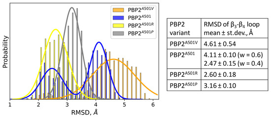 RMSD distribution plot for β3–β4 loop of variants of PBP2 and corresponding mean values and standard deviation of normal distributions. For PBP2A501, weight of each mode is in parenthesis.