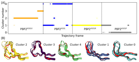 We combined all MD trajectories to perform a joint analysis of conformations of the β3–β4 loop using clusterization. We started with a set of dihedrals describing the backbone of the loop and then reduced the space to 14 principal components. The entire set of conformations is described by five clusters (Figure 4). The results of clusterization are shown in Figure 4. The dynamic behavior of the PBP2A501P variant with the highest antibiotic resistance demonstrates a closed, slightly moving β3–β4 loop pressed to the protein. PBP2A501V with the highest k2/KS value is characterized by an open, externally oriented, and labile β3–β4 loop. The PBP2A501 variant is characterized by two different types of conformations that are in line with the bimodal distribution of the RMSD values (Figure 3). One of them shares the same cluster with the PBP2A501R variant, which can be attributed to the closed states. The other cluster of PBP2A501 corresponds to the open state.