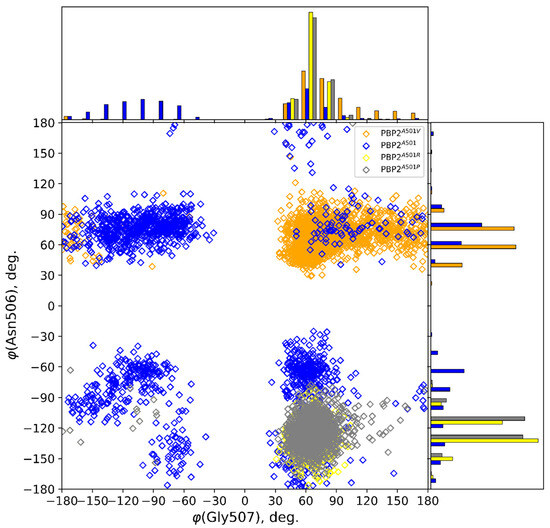 Distribution of φ(Gly507) and φ(Asn506) over MD trajectories for PBP2 variants.