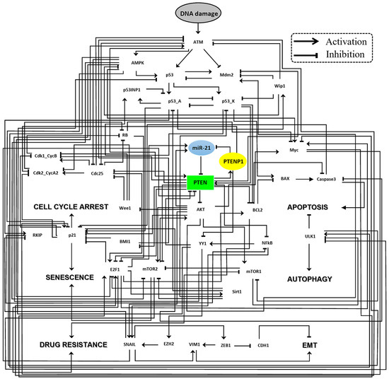 The network comprises forty-three signaling components, including one miRNA (miR-21) and one lncRNA (PTENP1). DNA damage is also incorporated as a single input with two possible states: “ON” and “OFF.” Additionally, there are six outputs to the model, representing drug resistance, EMT, cell cycle arrest, senescence, apoptosis, and autophagy. Furthermore, the network contains 117 direct connections among these signaling components (refer to Figure 1 for detailed visualization).