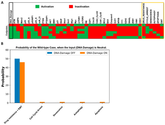 Dynamics of the wild-type case network illustrating six fixed points or endpoints. (A) The left-most column depicts DNA damage levels highlighted in the black box, while the right-most column presents the model outputs: drug resistance, cell cycle arrest, senescence, autophagy, apoptosis, and EMT, which are highlighted in the orange box. Each line represents a fixed point corresponding to the input. Red cells denote the inactivation of the corresponding molecule or phenotype, whereas green cells denote the activation of the corresponding molecule or phenotype (value 1). (B) A Monte Carlo simulation (100,000 runs) for determining each fixed point or phenotype in a wild-type scenario under a “Neutral” input. For more detail, see Section 2.1.
