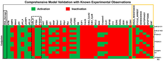 Validation of the Boolean model against known experimental findings: Perturbations were executed on the corresponding molecules, with ectopic expression (E1) representing gain of function (GoF) and knockdown (KO) representing loss of function (LoF). Active network components are illustrated in green cells (ON), indicating activation, while inactive ones are shown in red cells (OFF), indicating inactivation. Fixed points or endpoints were established for specific modeling scenarios, including miR-21 E1, miR-21 KO + PTEN E1, PTEN E1, PTENP1 E1, and PTENP1 KO. These molecules are highlighted with dotted black lines. Input DNA damage is presented in the left column, highlighted in a black box, while model outputs such as drug resistance, cell cycle arrest, senescence, autophagy, apoptosis, and EMT are displayed in the right column, highlighted in an orange box. Each line depicts a single fixed point associated with the input. For more detailed information, refer to Section 2.2.