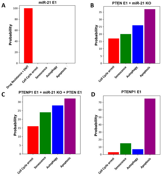 The impact of the PTENP1/miR-21 and PTEN axis on EMT, drug resistance, and cell fate decisions in DDR. Overexpression (E1) represents gain of function (GoF) and knockdown (KO) represents loss of function (LoF) perturbations. (A) miR-21 overexpression. (B) PTEN overexpression with miR-21 knockdown. (C) PTENP1 and PTEN overexpression with miR-21 knockdown. (D) PTENP1 overexpression. Each bar represents a cell fate decision, including cell cycle arrest, senescence, autophagy, apoptosis, and EMT + drug resistance. We conducted 100,000 Monte Carlo simulations for each perturbation. For further details, refer to Section 2.3.