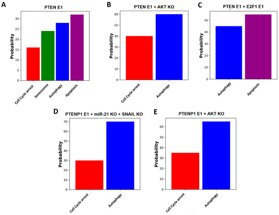 In the first perturbation (Figure 5A), amplifying PTEN expression triggers a cascade of cellular responses: halting the cell cycle at 16%, entering senescence at 24%, inducing autophagy at 28%, and initiating apoptosis at 32%. Moving to the second perturbation (Figure 5B), AKT knockdown combined with PTEN overexpression results in 40% cell cycle arrest and 60% autophagy. In the third perturbation (Figure 5C), PTEN overexpression alongside E2F1 overexpression leads to 45% autophagy and 55% apoptotic cell death. Next, the fourth perturbation (Figure 5D) involves PTENP1 overexpression coupled with miR-21 and SNAIL knockdown, resulting in 30% cell cycle arrest and 70% autophagy. Lastly, the fifth perturbation (Figure 5E) entails PTENP1 overexpression and AKT knockdown, yielding 35% cell cycle arrest and 65% autophagy, serving as potential strategies for inhibiting EMT and drug resistance.