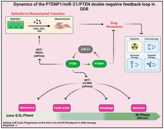 The lncRNA PTENP1/miR-21/PTEN axis in DDR: A double negative feedback loop combating drug resistance and EMT. This intricate interplay orchestrates vital cellular processes, inhibiting the AKT/SNAIL pathway to halt EMT progression and fortify drug resistance. PTENP1 upregulation suppresses miR-21, boosting PTEN levels. PTEN’s elevation impedes the AKT/mTOR pathway, regulating cell cycle, senescence, autophagy, and apoptosis. This axis emerges as a pivotal target for novel cancer therapies.