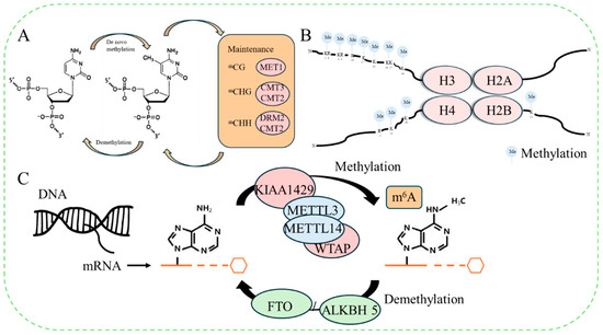 Epigenetic modification of plant methylation. (A) DNA methylation; (B) histone methylation; (C) RNA m6A methylation. METTL3/4: methylases; KIAA1429, WTAP, FTO: modified protein; ALKBH5: demethylases.