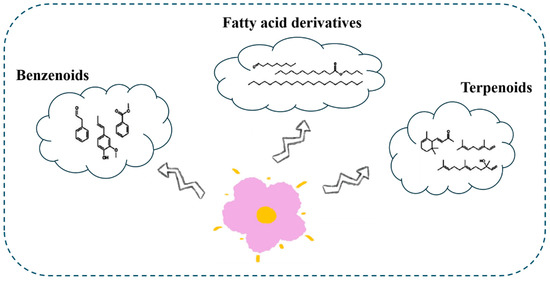 Floral aroma, a key ornamental trait in plants, arises from numerous volatile compounds, and the composition of these compounds varies among plant species and varieties. More than 700 different odor compounds have been identified in plant petals, with the majority being methylated derivatives. This further demonstrates that methylation modifications can influence volatile compounds synthesis [28]. The essence of petal aroma is volatile aromatic substances emitted by plants. The synthesis pathways of plant volatile compounds can be classified into three main categories: terpenoids, phenylpropanoid/benzenoids, and fatty acid derivatives [29] (Figure 2).