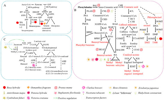 Regulation of aroma synthesis in plant petals. (A) Diagram of structural genes involved in the synthesis of terpenoids in flowers; (B) diagram of structural genes involved in the synthesis of benzenoids in flowers; (C) diagram of structural genes and specific transcription factors involved in the synthesis of fatty acid derivatives in flowers.