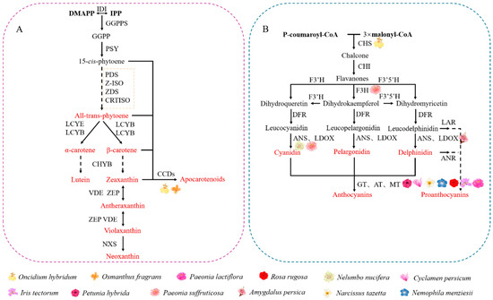 Key enzyme genes in the pathway of phytochrome metabolism in plant petals. (A) Diagram of structural genes involved in the regulation of carotenoid metabolism in flowers; (B) diagram of structural genes involved in the regulation of flavonoid metabolism in flowers.