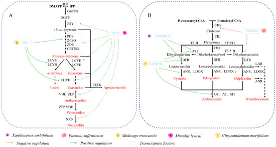 Transcription factors in the pathway of phytochrome metabolism in plant petals. (A) Diagram of specific transcription factors involved in the regulation of carotenoid metabolism in flowers; (B) diagram of specific transcription factors involved in the regulation of flavonoid metabolism in flowers.