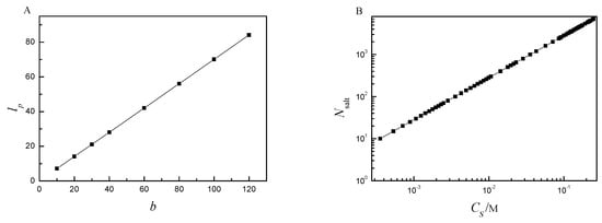 (A)The persistence length lp vs. bending energy b; (B) the number of salt molecules Nsalt in solution vs. salt concentration CS.