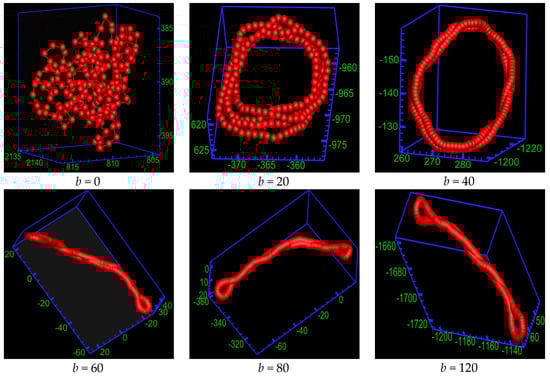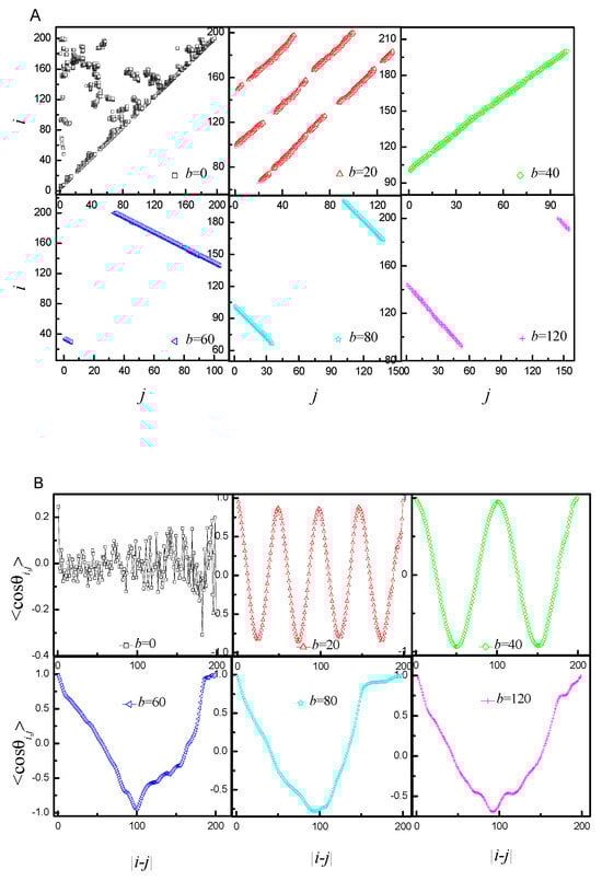 For the sake of analyzing the structure of a chain, one needs a method that will let us know the monomer contact distribution. It can be achieved by generating so-called contact maps, which are essentially a representation of 3D connectivity in a two-dimensional map. We regarded a monomer i and a monomer j in contact when they are found within the radius of 2.5 [] and |i − j| is larger than 2. Figure 3A shows the contact maps of the corresponding representations of the ring PE’s conformations from Figure 2. In addition, the average cosine between the backbone bond vector and as a function of the distance along the chain backbone |i − j| is introduced. Figure 3B shows the of the corresponding representations of the ring PE’s conformation from Figure 2. By combining them, the conformations of ring PE can be extremely correctly characterized. Both the contact map and are totally disordered for b = 0. The contacts give rise to a positive slope in the contact map, and assumes periodicity for b = 20 and 40. In addition, the number of straight lines is one fewer than Nring, while the number of periods of is equal to Nring. The contacts give rise to negative slope in the contact map, and the curve of is V-shaped for b = 60, 80 and 120.
