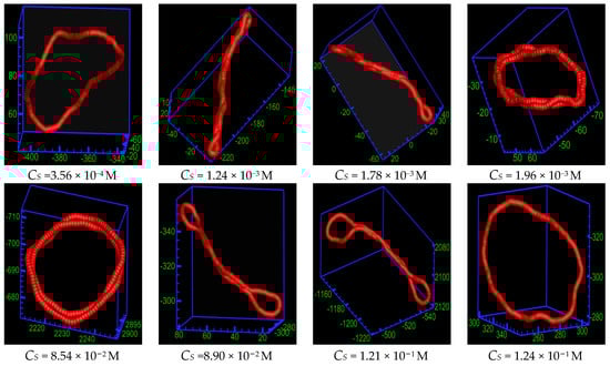 Next, we study the conformation of the ring PE at different salt concentrations CS for b = 60, as shown in Figure 4. The conformation of the ring PE is loop-like at CS = 3.56 × 10−4 M (Nsalt = 10). The salt solution is very dilute at CS = 3.56 × 10−4 M. There are only ten tetravalent cations in the solution, i.e., the Debye screening length is very large. The cation bridge does not affect chain conformation, while the rigidity of the ring PE is moderate. Therefore, the bending energy plays dominant role. As the CS increases, the ring PE folds into two-racquet-head spindle at CS = 1.24 × 10−3 M (Nsalt = 35) and 1.78 × 10−3 M (Nsalt = 50). More tetravalent salt is added into solution. The cation -bridge begins to exert an influence, but its influence is not large enough to drive the ring PE bend. Therefore, the ring PE chain forms two-racquet-head spindle. Upon the continued addition of salt, the conformation of ring PE becomes toroid at CS = 1.96 × 10−3 M (Nsalt = 55) and 8.54 × 10−2 M (Nsalt = 2400). There are enough tetravalent cation to screen the electrostatic repulsion between monomers. The competition among the bending energy, cation bridge, and entropy is very fierce. The cations cause a stronger bridging of monomers of the ring PE. Forming toroid is beneficial to entropy increase and energy reduction. As more salt is added, the ring PE folds into the two-racquet-head spindle again at CS = 8.90 × 10−2 M (Nsalt = 2500) and 1.21 × 10−1 M (Nsalt = 3400), and the size of the racquet head increases with the increase of CS. Upon the addition of the multivalent salt, the Debye screening length decreases with CS increase. The bending energy takes the upper hand. At CS = 1.24 × 10−1 M (Nsalt = 3600), the conformation of ring PE becomes loop again. In the presence of an excess of multivalent salt present in the solution, the Debye screening length is very small. The influence of cation bridge is very trivial. The bending energy plays the dominant role. The semiflexible ring PE re-expands with a further increase of the salt concentration.