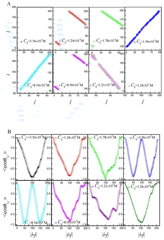 The Figure 5 shows the contact maps and of the ring PE in the corresponding snapshots of Figure 4. If the conformation is loop-like, there are no contacts in the contact maps for CS = 3.56 × 10−4 M and at CS = 1.24 × 10−1 M, as shown in Figure 5A, and the curve of is V-shaped, as shown in Figure 5B. If the conformation is two-racquet-head spindle, the contacts give rise to negative slope in the contact map for CS = 1.24 × 10−3 M, 1.78 × 10−3 M, 8.90 × 10−3 M and 1.21 × 10−1 M and curve of is V-shaped. If the conformation is toroid, the contacts give rise to positive slope in the contact map for CS = 1.96 × 10−3 M and 8.54 × 10−3 M, and assumes periodicity. By combining the contact maps and , the five phases of the ring PE can be extremely correctly characterized.