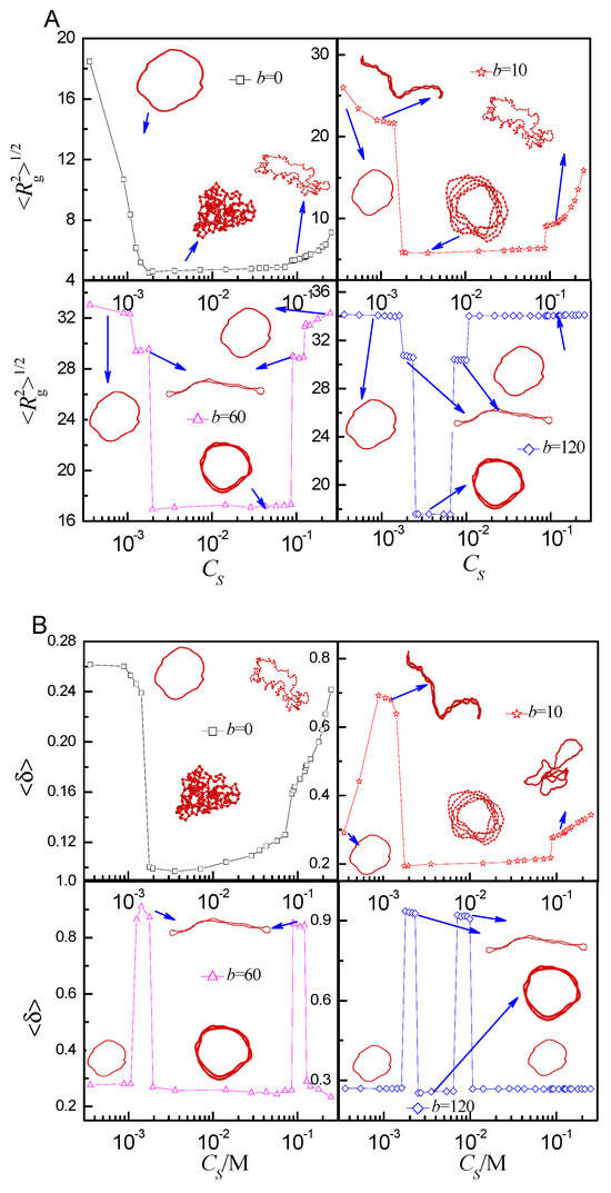 (A) The mean radius of gyration as a function of salt concentration CS for different bending energy b; (B) Shape factor <δ> as a function of CS for different b.