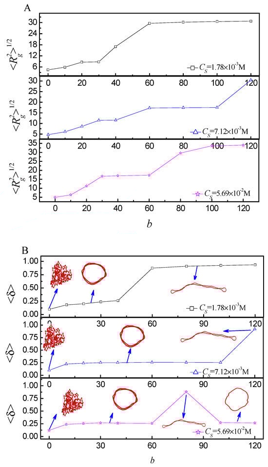 (A) The mean radius of gyration as a function of different bending energy b at different salt concentrations CS; (B) the shape factor < δ> as a function of b at different CS.