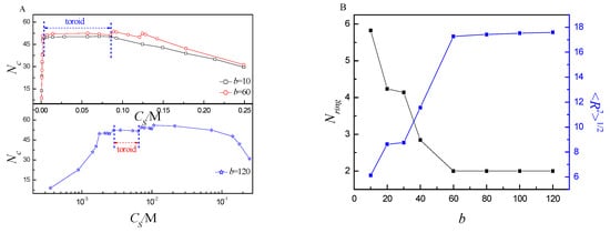 The toroid is the most important structure. Next, we discuss it in detail. When the tetravalent cations begin to condense onto the ring PE backbone [], monovalent counterions move away from the ring PE []. These condensed tetravalent cations may also cause localized twisting of the ring PE, which can facilitate collapse []. Due to monovalent counterions far away from ring PE, the translational entropy counterions is produced, which drives the ring PE twist further to become toroid. Therefore, it exerts an important effect on the folding of the ring PE []. When the distance from tetravalent cations to the ring PE backbone is less than the equilibrium bond length, the tetravalent is considered to be condensed. Figure 8A shows that the number of condensed tetravalent cation Nc responds to CS. The changing trend of Nc is in agreement with that of the conformation. In the regime of small CS and large CS, the Nc is small, which is one of reasons for the ring PE folding into loop. The Nc almost keeps constant in the regime of the toroid. It means that the number of torus ring Nring is almost the same at different CS in the regime of toroid for the same b. In addition, it can be observed that the total charge of the ring PE is neutralized in the regime of the toroid. The ring PE collapse is also determined by the total charge neutralization of the ring PE. Figure 8B shows that Nring and respond to b. It can be observed that the Nring decreases firstly, and then keeps constant with b increase. The largest Nring is 5.8 at b = 10. The rigidity of the ring PE is very small at b = 10, therefore, the ring PE can be twisted easily. With b increase from 10 to 60, Nring decreases to 2. The ring PE becomes more and more rigid, i.e., it is more and more difficult for ring PE to twist. Nring keeps constant when b is larger than or equal to 60. The range of CS for toroid becomes very small at b = 120. The changing trend of is in agreement with that of Nring. It further verifies that the Nring decreases with b increase.