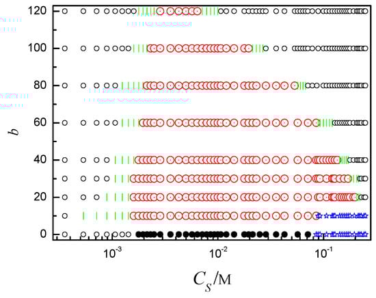 The ring polyelectrolyte state diagram in the values of bending energy b and salt concentration CS. Black ○ denotes loop, green | denotes two racquet head spindle, black ● denotes globule, blue ☆ denotes coil, red ☉ denotes toroid.
