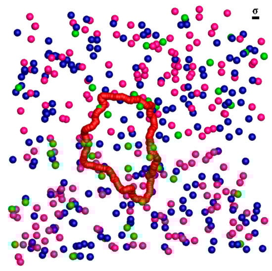 Simulations are carried out under NVT conditions in a periodic cubic box using the open-source software LAMMPS (version GPLv2) []. There are four types of interactions in the simulations. The first one is the short-range repulsive potential which accounts for excluded volume interaction among all the beads, including monomers of semiflexible ring PE, counterions, salt cations, and salt anions. It is modeled by the Lennard-Jones (LJ) potential [],