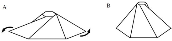In a previous paper [], we showed that the structure of the mechanosensitive ion channel protein (MscS), which is a membrane protein with an axisymmetric structure, similar to the membrane protein of the BMC, is analogous to the flasher origami model. Mechanical analysis of the flasher model demonstrated how the MscS protein can increase/decrease its length simultaneously along axes perpendicular to an axial stretching force. Structures with such properties are known as “auxetic”, which means that, counter to typical natural behavior and intuition, it expand in 3D when stretched, and contract in 3D when compressed []. Since the structure shrinks and expands in rotational motion, it is defined as “chiral”. The definition here for chirality refers to the mechanical structural property and not to the chemical chirality which results from the orientation of atoms in a stereoisomer. Furthermore, when the folds tilt vertically, the structure can rise from a flat shape to a dome shape via radial and tangential forces (Figure 2) [].