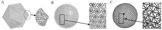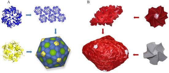 The comparison approach is applied to a spiral-based assembled origami model to demonstrate the effectiveness of the presented approach. BMC is an icosahedron (a regular polyhedron with 20 faces) organelle composed of a proteinaceous shell structure that maintains a highly specialized environment for biochemical reactions inside []. Its shell is composed of multiple protein homologs that self-assemble to form the defined architecture shown in Figure 1A, and as a result BMCs are candidates for engineered molecular scaffolds, which can be used for different applications, such as drug delivery vehicles [].