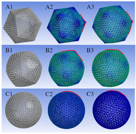 The mechanical changes due to forces are derived from an FEA in the commercial ANSYS® software (Ansys® Mechanical Products, Release 2021R) []. Based on the response to an internal pressure of icosahedrons with different levels of roundness, it appears that in a polygonal icosahedron with vertexes that are not rounded (Figure 7(A1–A3)), the planes expand locally, and the vertexes remain stiff. Hence, the BMC structure does not expand uniformly, like a balloon. As the vertexes in the CAD model are rounded and the structure becomes a semi-icosahedron (Figure 7(B1–B3)), the stiffening effect of the vertexes diminishes. Finally, when the BMC is a sphere (Figure 7(C1–C3)), the structure expands uniformly.
