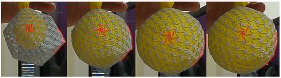 An experiment with a 3D-printed icosahedron. A chiral element and part of the silhouette are marked in red to demonstrate how the structure changes during expansion (from left to right).