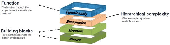 The hierarchical bottom-up arrangement of a layered bio-structure, from building blocks to function.