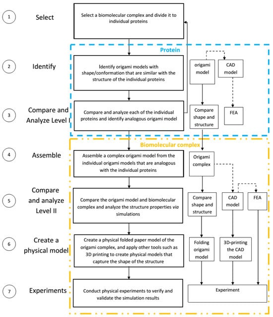- Comparing—Level II—Analyze and compare the shape and structure of the complex bimolecular structure from Step 1 with the assembled origami model that combines the individual origami models from Step 4. The comparison approach applied during analysis is similar to the steps described in Step 3. The origami model can be translated into a CAD model that is further analyzed via FEA.