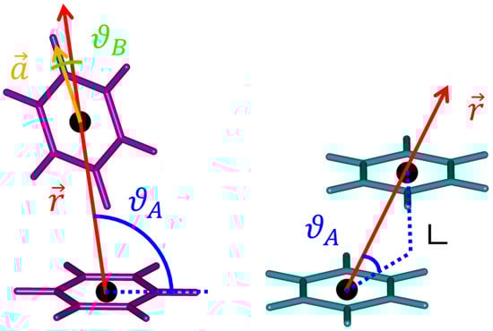 The tilted T-shaped (in magenta, to the left) and slipped-parallel (in cyan, to the right) structures of the benzene dimer, shown at the same scale. Also depicted is a schematic representation of the geometric parameters defining the respective angles and .