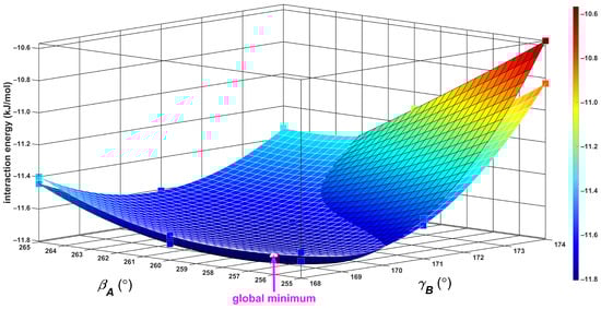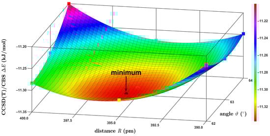 In spite of the relatively small size of the BD, an accurate description of the SP configuration (see Figure 1) is known to be quite difficult for high-level quantum chemical methods. In particular, a ca. 0.4 kJ/mol difference in the ΔE, as predicted by the CCSD(T)/CBS and by precise QMC computations for the SP structure from the S66 set [], was recently reported []. Here, the CCSD(T)/CBS minimum was found while employing two-dimensional (2D) grids that considered the aforementioned R distance and one of the , angles. These angles had the same value due to the presence of the horizontal mirror plane in the SP configuration. Hence, the angular variable is denoted simply as in what follows. Scouting calculations were performed using the ωB97X-3c/vDZP method in order to inspect the sensitivity of the results to changes in R and around the expected position of the minimum. Based on these results, an initial grid for the CCSD(T)/CBS computations was created. It covered points in quite wide pm and intervals of the R and values, respectively. An inspection of the resulting data enabled the choosing of a grid of only 3 × 3 points, which tightly enclosed a position of the minimum. Figure 5 presents the CCSD(T)/CBS ΔE obtained on this relatively narrow 2D grid (underlying values are provided in Table S4). These results illustrate the flat character of the PES around the minimum of the SP configuration, as the ΔE values computed on this grid cover an interval of about one-third of the kJ/mol. The minimum where ΔE = −11.34 kJ/mol was located by interpolation at the values, which are listed in Table 1. Also listed in Table 1 is a final ΔE value that was obtained for the minimum geometry by an application of the procedure expressed by Equation (2) (see Section 4).