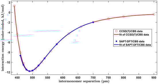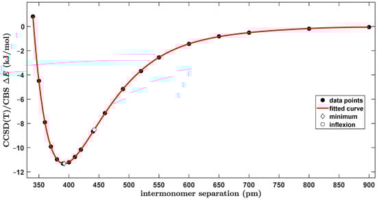 Furthermore, a series of constrained structures was prepared with fixed at 63.0° and covering a very large interval of values of the R distance, namely, from 340 to 900 pm. For these geometries, the CCSD(T)/CBS ΔE data were obtained in the same way as for the FT and TT configurations described above for the purpose of comparison of the intrinsic strength of intermolecular interactions in various binding modes of the BD. This comparison is provided in Section 3.2, while Figure 6 shows the fitted curve (the underlying values are collected in Table S5). The curve reaches an ΔE of zero kJ/mol at 341.3 pm, has a minimum at R = 392.0 pm where ΔE = −11.33 kJ/mol and has an inflexion point at R = 442.2 pm where ΔE = −8.51 kJ/mol.