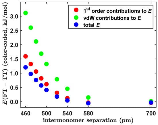 This revisit of the most stable configurations of the BD consistently applied the CCSD(T)/CBS methodology to obtain the minimum geometries and associated ΔE values of the TT, FT and PD structures. An ordering of the enthalpic stabilization of these structures agreed with the most recent results [], as a matter of course, and the differences are insignificant between the respective ΔE values found here and in references [,] (see Table 1). Furthermore, the deformation energy of the monomers (see the most recent investigations [,], into an influence of internal deformations on the strength of noncovalent bonding) was found to be small and very similar in the TT and PD minima, amounting to 0.127 and 0.096 kJ/mol when estimated for the TT and PD minima, respectively, at the CCSD(T)/CBS level using the pertinent PBE0-D3/def2-TZVPP geometries (see Section 4 for details and references). The present structural and energetics data were utilized in the framework of an analysis of factors that caused the tilted T-shaped dimer to be the GM, and in the subsequent paragraph, they were employed for a description of the intrinsic strength of intermolecular interactions. The difference in the final ΔE values predicted for the CCSD(T)/CBS optimized geometries of the tilted and canonical T-shaped configurations amounted to −0.50 kJ/mol (see Table 1). An almost identical result of −0.51 kJ/mol was obtained from the DFT-SAPT/CBS interaction energy curves, which are presented in Section 2.2 and Section 2.3 and shown to closely match their CCSD(T)/CBS counterparts. Specifically, the DFT-SAPT/CBS interaction energy values in the minimum of the pertinent curve were −11.80 and −11.29 kJ/mol for the TT and FT configurations, respectively. The DFT-SAPT/CBS results are thus fully reliable and employed here to describe the physical contributions to the total value of the interaction energy in the two investigated structures (details of the underlying calculations, together with references, can be found in Section 4). It should be noted that in the rest of this section, the symbol E (and not ΔE) is used for various components of the DFT-SAPT/CBS interaction energy. Namely, and denote the electrostatic and exchange (Pauli repulsion) terms, respectively, arising in the first order of the perturbation theory of intermolecular interactions []. The sum of these two contributions is denoted as . Furthermore, designates the sum of the second-order London dispersion terms, while collects the second-order induction terms and an estimate of higher-order contributions. The total DFT-SAPT/CBS interaction energy, , is the sum of the aforementioned components (). Importantly, Carter-Fenk and Herbert proposed to group the and terms together to obtain what they termed the “van der Waals” (vdW) contribution to the interaction energy, []. Of course, , and they used this partitioning in an analysis of intermolecular stacking interactions in the dimers of organic molecules [] (this analysis was questioned in reference []). They also noticed that their data correctly predicted the TT configuration of the BD to be “slightly lower in energy than the canonical T-shaped structure” []. However, as the present DFT-SAPT/CBS results show (see Figure 7), a preference for the tilted structure can be much better explained by considering E1 contributions instead of their counterparts. This holds throughout a wide range of intermolecular separations, namely, from 460 to 700 pm (raw values of pertinent interaction energy terms are collected in Table S7). It should be pointed out that at lower distances between monomers, the model that employed the data significantly overestimated the differences between the total interaction energy of the FT and TT configurations, and this overestimation was much lower when the E1 values were considered. In a close vicinity of the respective minima, that is, at R = 490 pm, the difference between the values of the two perpendicular arrangements amounted to approximately −11.26 − (−11.67) = 0.41 kJ/mol, while the corresponding differences between the and E1 data were 1.32 and 0.62 kJ/mol, respectively. These results imply that for a given E distance, the sum has a similar value in the two investigated configurations, contrary to the corresponding sum (see Table S7). Due to this partial cancellation of the higher-order contributions to the interaction energy, changes in the first-order terms quantitatively explain the observed preference for the tilted structure to be the GM.