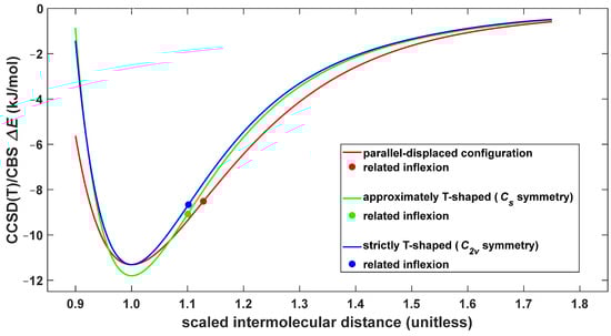 Figure 4 also presents the SAPT-DFT/CBS data. They were, of course, computed at the same points from an interval of R ranging from 460 to 700 pm, as in the tilted T-shaped geometry and shown in Figure 3 above, as they are employed in Section 3.1 for a comparison of the two perpendicular-like configurations of the BD. Importantly, the SAPT-DFT/CBS values in this range of intermolecular distances closely match their CCSD(T)/CBS counterparts (see Figure 4 and Table S3). As a consequence, the minimum of the fitted SAPT-DFT/CBS curve is located at R = 495.6 pm, where ΔE = −11.29 kJ/mol, which is in good accord with the corresponding CCSD(T)/CBS results.