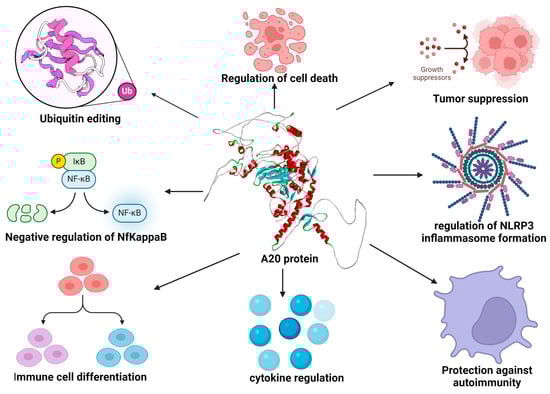 - Martens, A.; van Loo, G. A20 at the Crossroads of Cell Death, Inflammation, and Autoimmunity. Cold Spring Harb. Perspect. Biol. 2020, 12, a036418. [Google Scholar] [CrossRef]