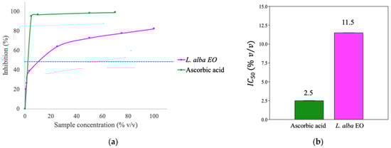 Phenolic compounds, in particular, flavonoids, the most common class of antioxidant secondary metabolites, were detected in the EO (Table 1). Moreover, the antioxidant power of EO was evaluated by DPPH free radical assay (Figure 2a), and IC50 value was calculated and compared with that of ascorbic acid, used in the test as positive control (Figure 2b). The IC50 of the oil was 4.6 times lower compared to the IC50 of ascorbic acid (Figure 2b), the most powerful antioxidant molecule.