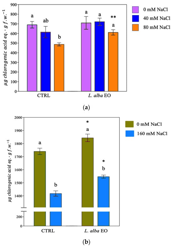 Phenolic compounds of bean (a) and tomato (b) plants. Data are expressed as mean ± SE (n = 6). Mean values in the column marked by different letters are significantly different within the same group (p < 0.05; ANOVA and Tukey–Kramer test). Significant differences to CTRL are reported as * p < 0.05; ** p < 0.01.