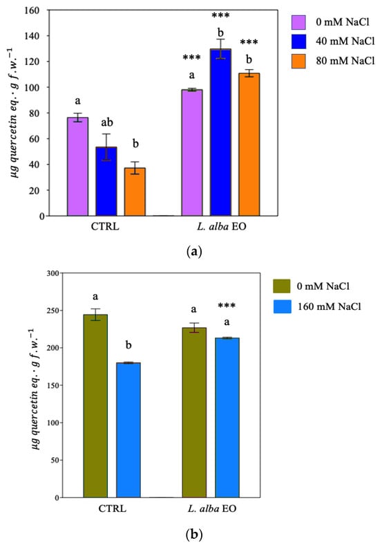 Flavonoids of bean (a) and tomato (b) plants. Data are expressed as mean ± SE (n = 6). Mean values in the column marked by different letters are significantly different within the same group (p < 0.05; ANOVA and Tukey–Kramer test). Significant differences to CTRL are reported as *** p < 0.001.
