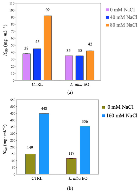 Antioxidant activity, reducing power, and scavenger activity of the plants were analyzed by the DPPH, FRAP, and P-FRAP tests, respectively. Salinity decreased the antioxidant activity of not primed bean and tomato plants (Figure 5a,b, Figure S3a–c and Figure S4a,b). On the contrary, EO improved the antioxidant activity, reducing power and scavenger activity of all stressed and not stressed primed plants compared to not primed CTRLs (Figure 5a,b, Figure S3a–c and Figure S4a,b, Table 3). In particular, the antioxidant activity of bean primed plants irrigated with 80 mM NaCl (Figure 5a) showed the IC50 of 42 mg/mL vs. 92 mg/mL of CTRL. Similar behavior was observed in tomatoes, leading to a better salinity tolerance (Figure 5b).
