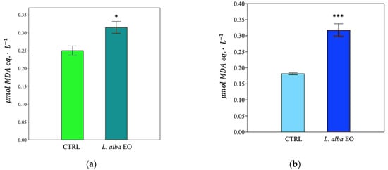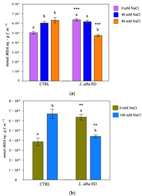 Although there are scientific papers concerning the biotechnological use of EOs as priming agents [32,33], there are no literature studies regarding the mechanism of action of L. alba EO in plants exposed to salt stress. The latter is responsible for the onset of ionic, osmotic, and oxidative stress in plants, leading to the death of the organism if enzymatic and non-enzymatic antioxidant defence systems are not quickly activated [34]. ROS production is the most damaging and fatal event for a plant under stress conditions; such toxic molecules damage DNA, proteins, plasma membrane, and cytoplasmic organelles, when the antioxidant mechanism are absent or not quickly activated [35].