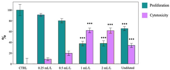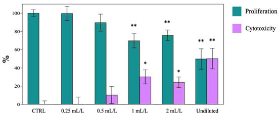 The effect of EO on cancer cell proliferation and its cytotoxicity was concentration-dependent, even though showing important differences among the three cell lines was considered. Increasing concentrations of EO significantly reduced the proliferation of MDA-MB-231 cells with increasing toxicity when compared to the control cells (CTRL) treated with DMSO (Figure 7). The most significant effects on cell viability were observed in SUM149, where 1 and 2 mL·L−1 of EO led to 70% of cell death (Figure 8). The peculiar effects, observed in SUM149 treated with undiluted EO, could be a consequence of the lower solubilization of oil in the culture medium, which may have reduced the antiproliferative and cytotoxic potential of the EO, leading to the results reported in Figure 8.