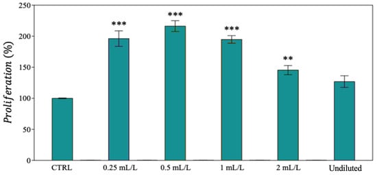 Due to the limited solubilization of undiluted EO in the culture medium, at the end of this first set of experiments, it was decided to treat the MDA-MB-231 and SUM149 cell lines with oil at Cf = 2 mL·L−1. An opposite scenario was observed in MDA-MB-468 after 48 h of treatment: i.e., an increase of proliferation (from +25% to +120%) was detected in the treated cells (Figure 9). In the latter, the treatment seems to act as an activator of cell proliferation, in contrast to what was observed in the other cell lines, where the oil exhibited a strong cytotoxic effect. This was the reason why MDA-MB-468 cells were excluded in the following tests.