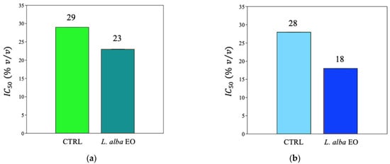 Basing on the characteristics of the components, L. alba EO may have different applications in human health and agriculture. The determination of antioxidant properties of the oil of L. alba was performed by analyzing the content of phenols and flavonoids, which concentrations are 177.3 ± 4.2 μg of chlorogenic acid equivalents·mL−1 and 17.2 ± 2.1 μg of quercetin equivalents·mL−1, respectively. The presence of these secondary metabolites in the EO allowed the evaluation of the antioxidant power using the DPPH assay and the calculation of the IC50. This value was then compared with the IC50 of ascorbic acid. Even thought, the antioxidant power of L. alba oil was found to be 4.6 times lower than ascorbic acid, this value was higher with respect to other plant extracts reported in the literature [29,30]. After the determination of the presence of antioxidant compounds in oil, the study focused on the effects of EO treatment in tumor cells and plants exposed to stress conditions.