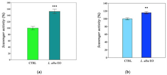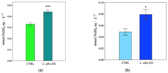 In the MDA-MB-231 cell line, upon treatment with EO, we determined an increase in antioxidant activity, as IC50, (Figure 10a and Figure S5a), as well as a significant improvement in reducing power and scavenger activity, i.e., +31.3% and +60%, respectively, when compared to the CTRL (Figure 11a and Figure 12a). A similar behavior was detected in SUM149, where the antioxidant activity improved in samples treated with oil (Figure 10b and Figure S5b), with increments of +60% and +20%, respectively, in the ferric and potassium ferricyanide reducing power and scavenger activity, found in treated samples when compared to CTRL (Figure 11b and Figure 12b).